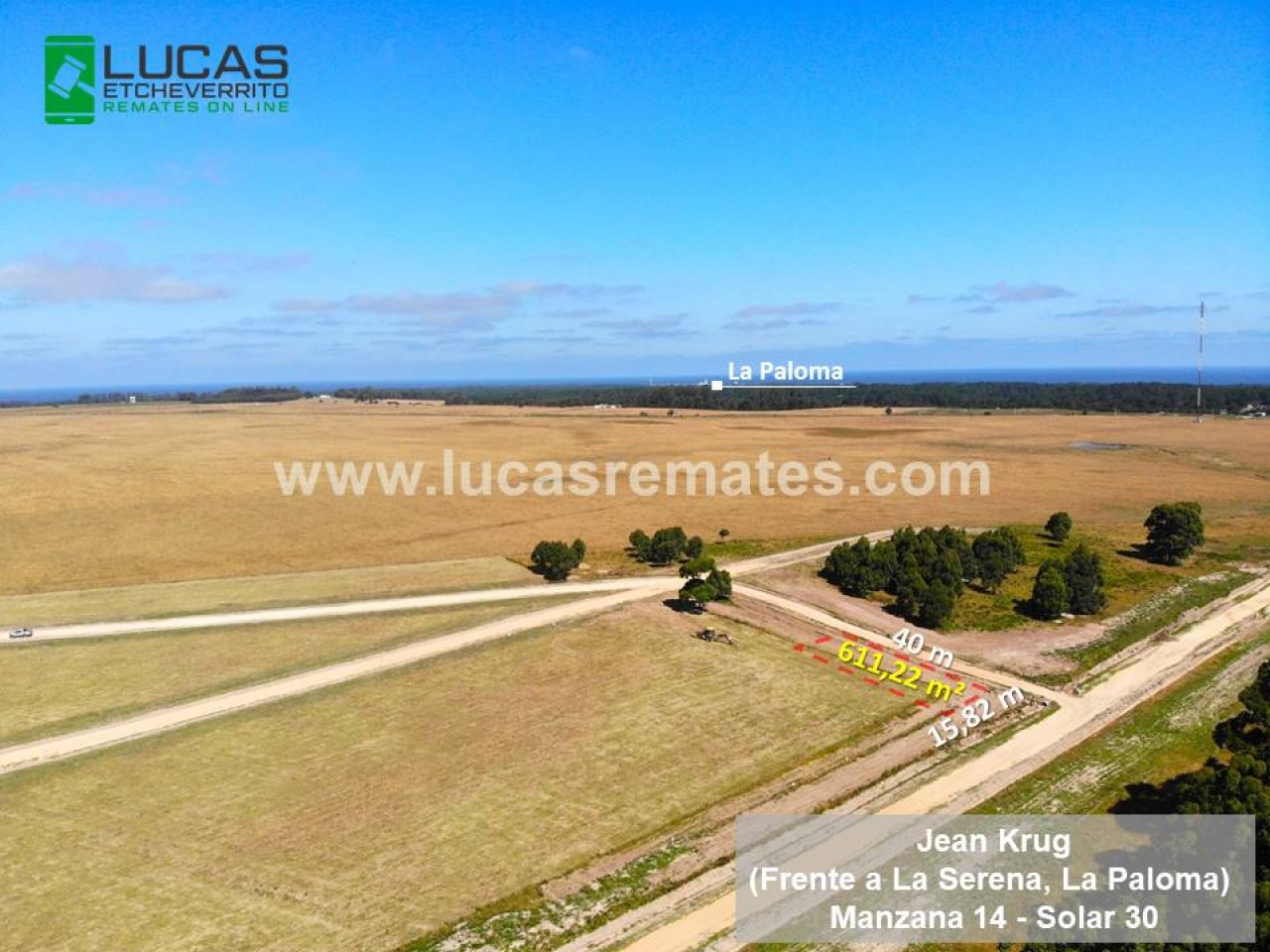 Muy buen terreno esquinero de 611,22 m2 a 5 minutos del Balneario La Paloma, Playa Serena y Laguna de Rocha. Se encuentra limpio, amojonado por agrimesor y con toda la contribución año 2026 pagada. Observaciones: Cuenta con una pendiente.