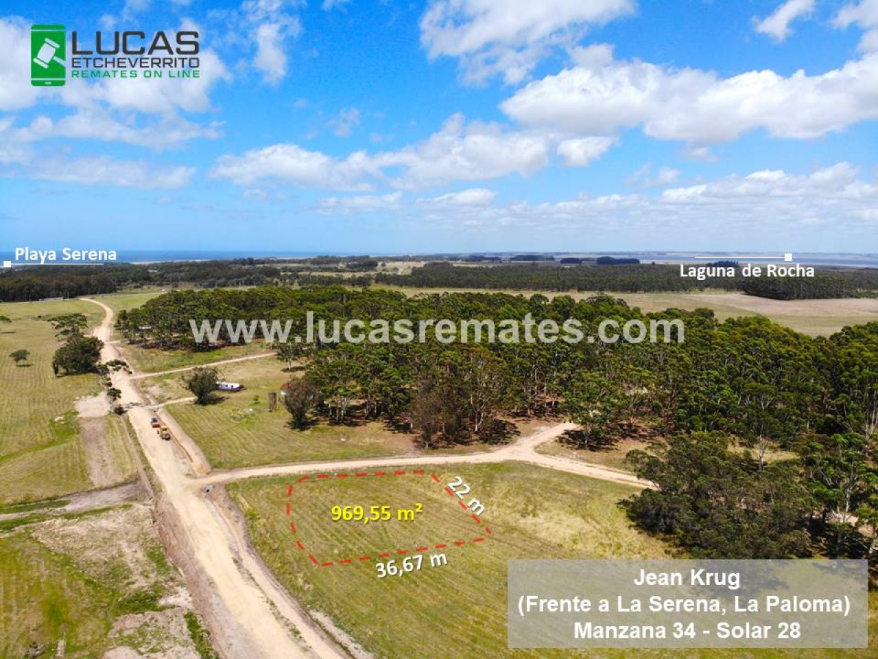 Excelente terreno esquinero de 969,55 m2 a 5 minutos del Balneario La Paloma, Playa Serena y Laguna de Rocha. Se encuentra limpio, amojonado por agrimesor y con toda la contribución año 2026 pagada.